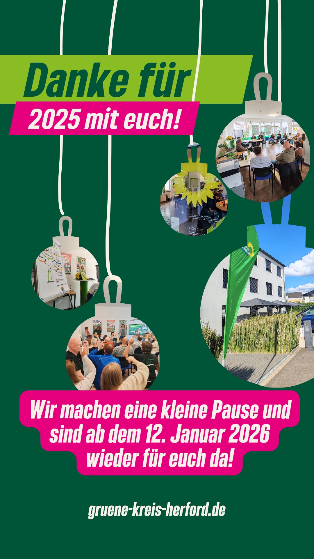 Danke für euer Engagement, eure Zeit, eure Ideen und eure Unterstützung im vergangenen Jahr. Ob bei Aktionen, Wahlkämpfen, Sitzungen, Veranstaltungen oder im Hintergrund: Euer Einsatz macht einen großen Unterschied für eine ökologische, soziale und gerechte Politik.